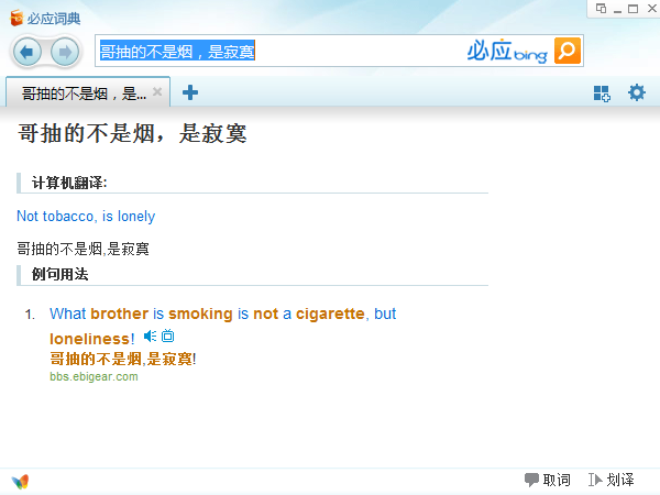 黄鼎隆在演示中,必应词典桌面版可以翻译出“哥抽的不是烟,是寂寞。”、“囧”、“犀利哥”等词语或句子。这些翻译并非雷人英语,而是微软根据最常用的词典库(包含微软Office词典)、微软数据挖掘术保证从网上及时收录流行语;英语专家人工纠错,补充翻译;智能的容错输入,多重检索超给力之后给出的结果。