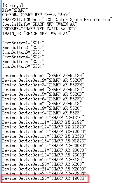 近期有部分朋友反映,夏普AR-1808S一体机扫描部分的驱动装不上,无论夏普官网还是驱动精灵提供的驱动都不行,后台统计中也有相当一部分AR-1808S安装失败的数据,经检查是由于夏普失误,没有将AR-1808S扫描部分的硬件ID写入inf,导致驱动无法识别扫描仪,找到问题原因就好解决了,我们需要做的就是手动把该硬件ID添加进驱动程序里。