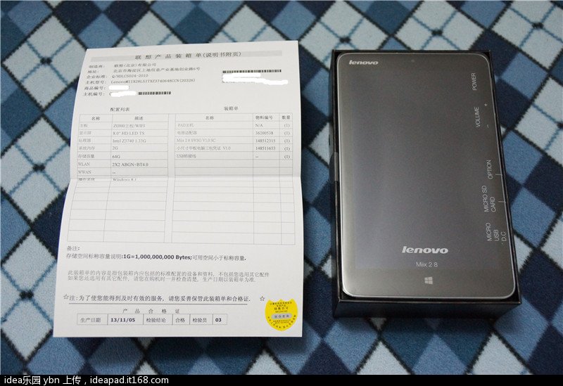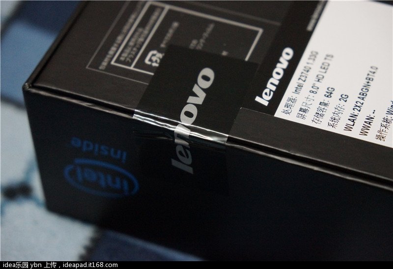 联想miix2 8的包装盒整体风格和其他类似平板电脑差别不大,不过背面并没有对于平板电脑功能上过多的介绍和说明,而是最简明扼要的列出了具体的机器配置