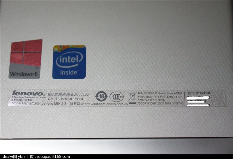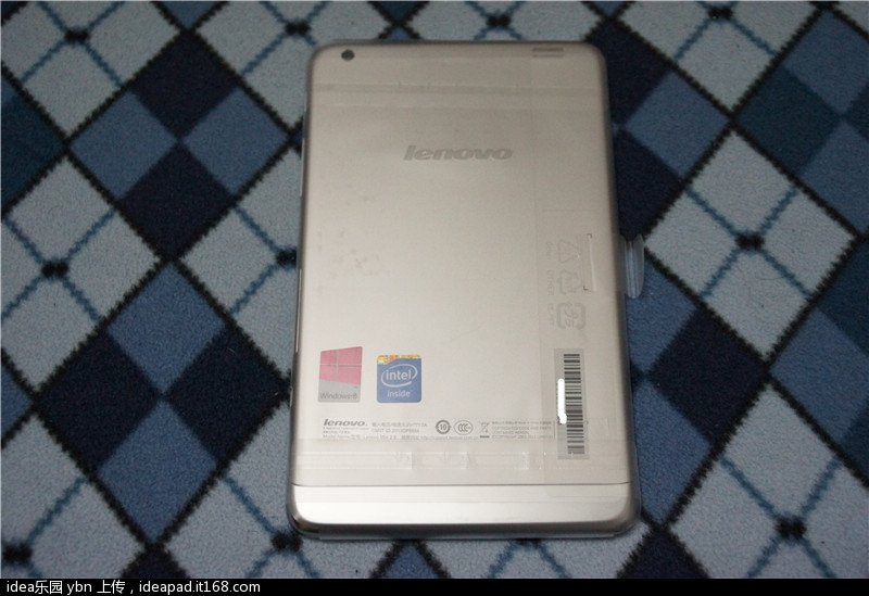 要说联想miix2 8的整体造型,感觉虽然不像有的平板那样造型非常硬朗,但是和以前有段时间联想提出的“鹅软石”设计有点类似,特别是各个边角设计的较为圆润,让你拿在手上丝毫不用担心可能硌手的问题,同时因为win键触摸键的设置导致lenovo的logo相应的放到了机器的左上角,个人感觉这样比其他联想的平板或者手机之类的将lenovo logo放在正面下方要好看得多,另外后背除了下方一条考虑到wifi信号采用的塑料其他部分也基本是金属材质,看到intel和win8的标签纸也感觉非常“亲切”啊