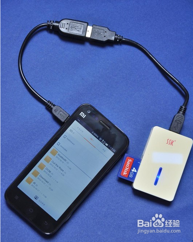 只要将MicroUSB端口连接手机,再将USB端口连接相应数码设备即可。