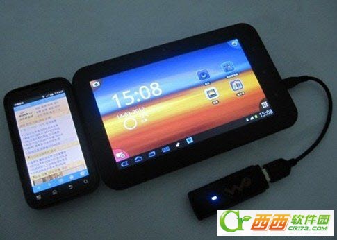 再举个例子,比如我们一般购买的平板电脑,仅支持Wifi无线上网,如果我们要实现3G无线上网怎么办?其实也很简单,只要我们平板电脑支持OTG功能,就可以通过OTG数据线将平板电脑与USB 3G网卡连接起来使用,至此就实现了平板电脑也能实现3G无线上网了,如下图: