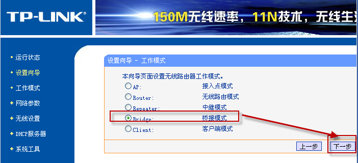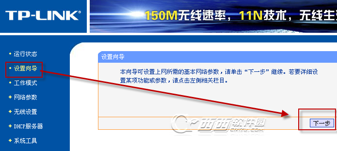 1、设置向导,下一步本向导可设置上网所需的基本网络参数,请单击“下一步”继续。若要详细设置某项功能或参数,请点击左侧相关栏目。