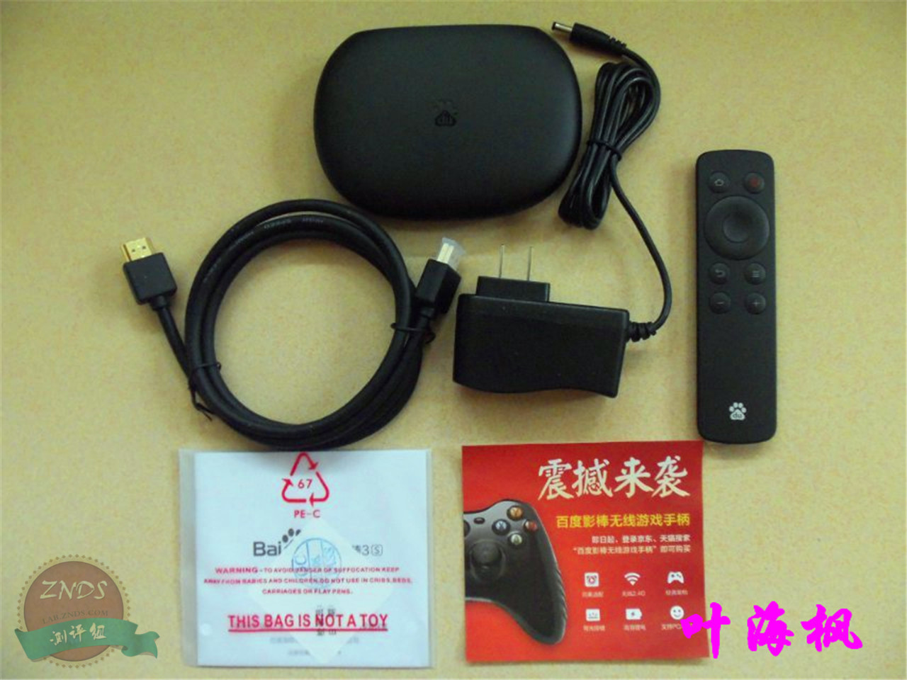 【小结】百度影棒3S的包装简约大气,背面附有详细的硬件配置参数列表,包装侧面加入了芒果TV inside的标识,百度影棒3S正式牵手正版视频运营商芒果TV。包装配件区没有采用独立小包装,而是散乱的摆放在盒内,显得不够严谨。接口比较少,没有Reset键和TF卡槽,刷机和升级固件极不方便。总体来说,百度影棒自二代开始,已经与传统意义上的影棒产品毫无瓜葛,无论是外形,接口,功能,还是配件,都与影棒的概念相左,而更接近于一款高清网络播放器的概念。