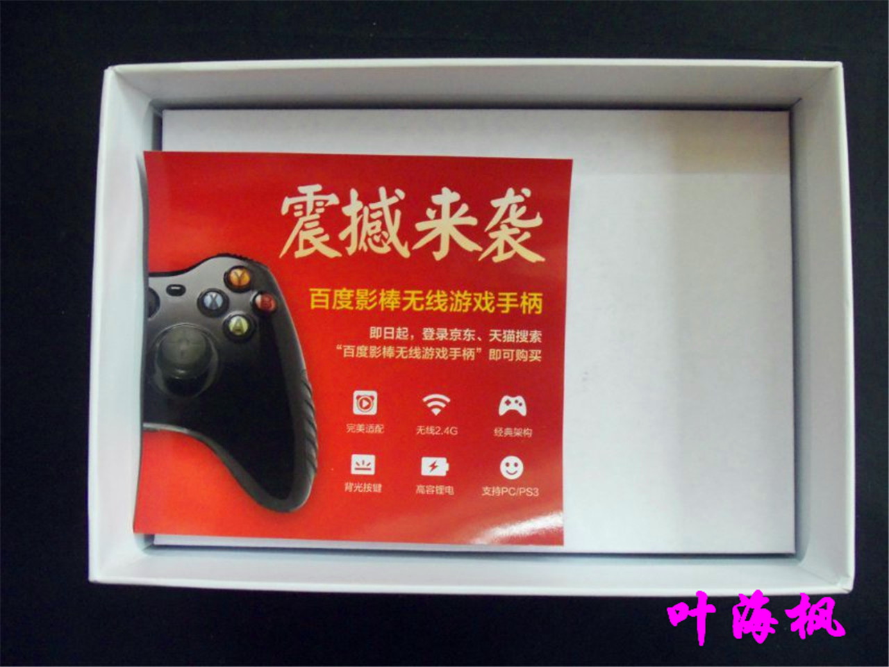 取出主机后,在于配件区的分隔层中,是一张百度影棒无线游戏手柄的宣传海报。