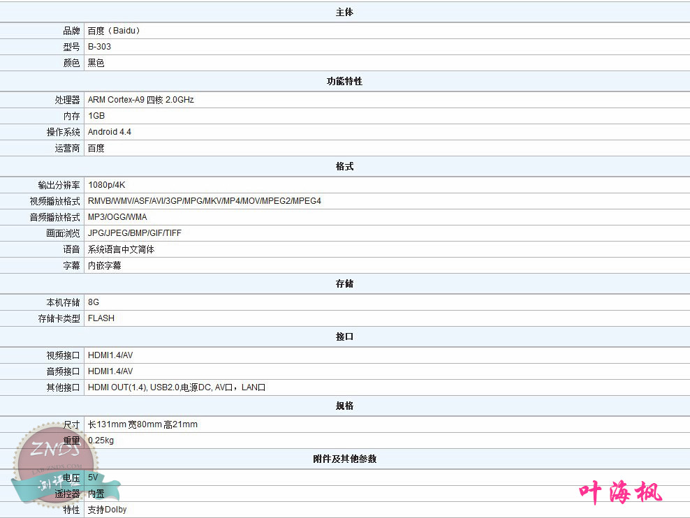 百度影棒3S采用最高主频高达2G的AMLOGIC S802 四核CPU, Mali-450八核GPU,以及1GB DDR3内存,8GBMLC NAND Flash,运行安卓4.4.2系统,支持市面上流行的多种视频文件格式、音频格式,兼容各种电视机,支持4K解码及输出。