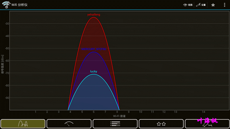 WIFI分析仪的测试结果,其中“yehaifeng”信号路由器距离3直线距离半米,中间隔有一堵厚约40CM的吃重墙。WIFI效果同样十分令人满意。