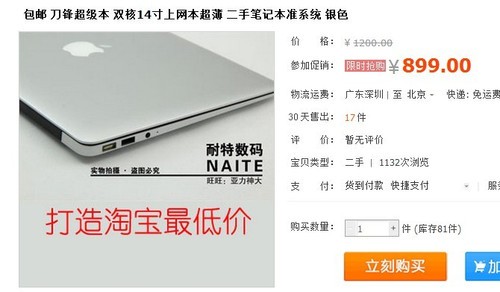 笔者随便截取淘宝上一个商品页面,可能不具有代表性,因为价格实在太扯了,但淘宝上用低价来忽悠人的方式是大同小异的,我们一起来瞧瞧,首先,用了 MacBook Air 作为产品第一张图片,并标注实物拍摄,在看边上的899元的售价,给人一种“就算是假苹果,也值了”的错觉,照片拍的很有水准,似乎让人忘了MacBook还有Unibody和阳极氧化铝这么一说。再看一眼标题,没有提到MacBook,只说是14英寸上网本,很好的规避了风险。