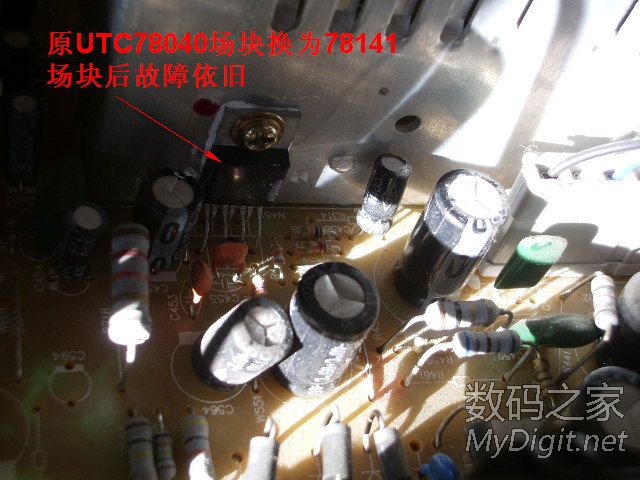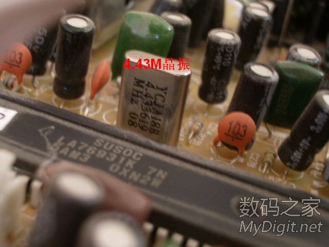 我是按如下顺序检修:1.换4.43晶体 2. 检查5V 8V电压 检查LA76931K 的11脚电压 是否为8V左右3. 不行就换个空白存储器。我从旧电视机上面拆下一个4.43晶振换掉后,试机图像颜色恢复正常,发现晶振焊盘上面有咖啡一样的颜色,怀疑是脱焊,再换回去试试看,果然是脱焊了。