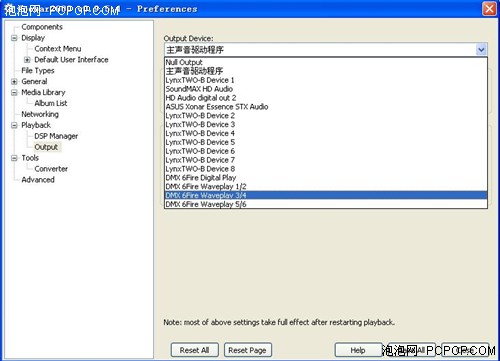下面,我们首先要解决的应用是听歌,我本人是喜欢用Foobar听歌,所以在Foobar里面的设置中选择DMX 6Fire Waveplay 3/4。