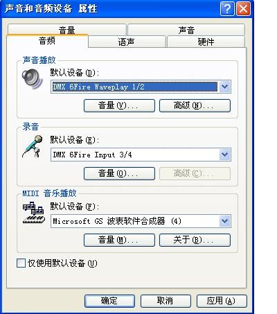 而对于游戏,很多游戏是不能设定音频设备的。因此,最保险的是我们在音频设备中设定默认设备,游戏就会使用这个设备出声。在这里,我选择了DMX 6Fire Waveplay 1/2为默认设备。但是还有一个问题存在,那就是:我要听歌,孩子要打游戏,都在音箱上出声肯定谁也不痛快。还好,DMX 6Fire USB还拥有一个耳机输出,对应在1/2口。这样孩子用我的耳机打游戏,我用我的音箱打游戏,互相不干扰。