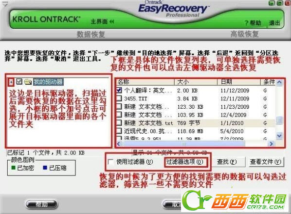 扫描之后,需要恢复的驱动器的所有文件及文件夹会全部呈现出来,现在需要的就是耐心地寻找、勾选,因为在恢复过程中文件夹的名称和文件的位置会发生一些变化,这时要细心的看,有一个过滤器选项可以更好的进行文件筛选,也可以在左侧框中点选全部目标,先把文件恢复以后再进行查找,选择完毕后点击下一步继续操作。
