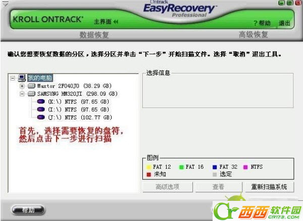 短暂的系统扫描之后,软件会加载电脑插入的所有磁盘盘符,在左侧选择你所需要恢复的分区,点击下一步开始对需要恢复的驱动器进行扫描。