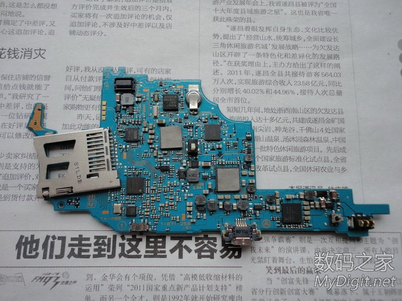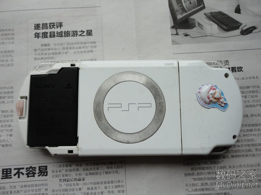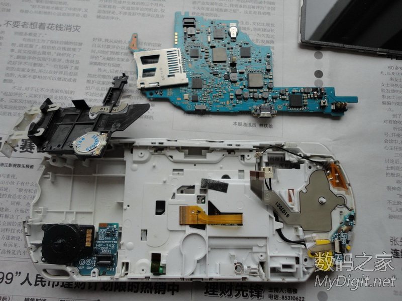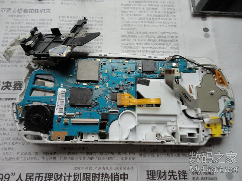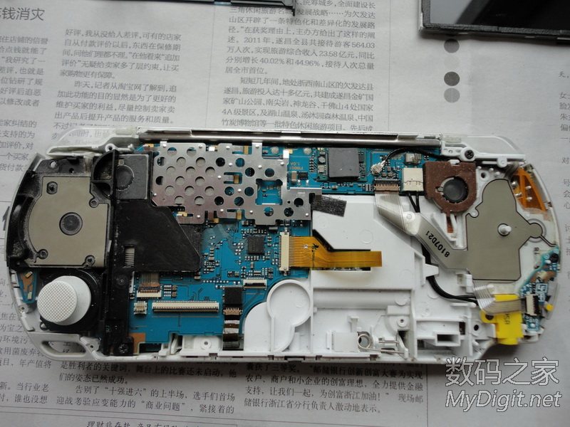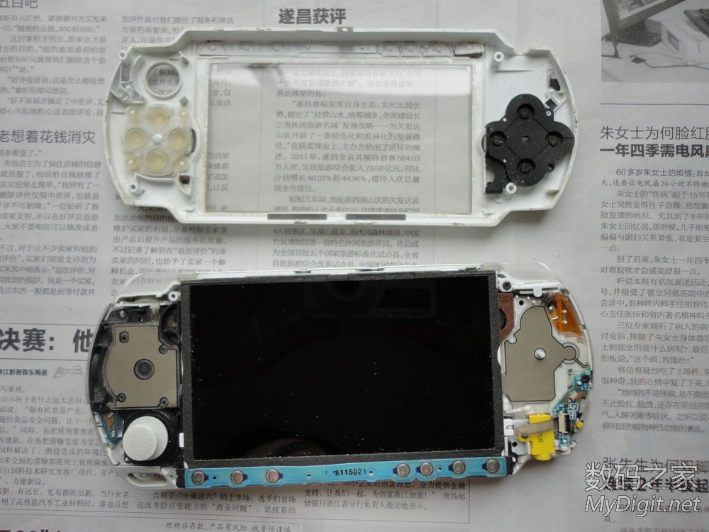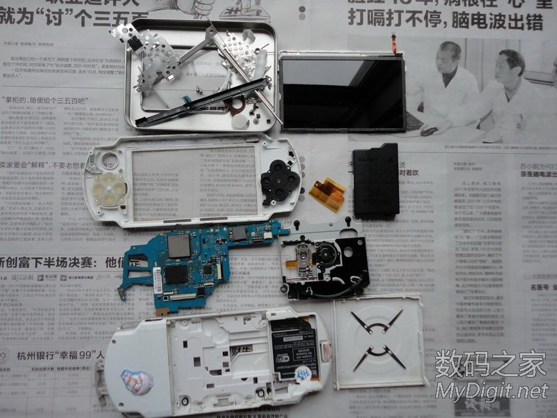 拆前故事:这是半年前朋友给我的有问题PSP,给我后没用几天就出现偶尔能开机的故障现象,有时候开机玩一会花屏,有时候直接黑屏,不过都玩不了多一会。二话没说凭着我对电子产品的兴趣就准备自己修理一下这个机子。查维修资料也查不到什么名堂,就直接拆,然后观察了一下里面电路没发现什么异常,简单测了些元件和开关部分也没发现什么地方不对,还吹了下部分IC,放了几天没信心修好它了装上,居然一下就能开机了,但是屏幕不亮了。又拆开发现有个保险电阻异常用铜丝代替装上好了,玩了没多久花屏,又不能开机了。哎折腾人啊!更惨的在后面呢!继续拆,一直没找到问题,屏的排线不知道谁给我折断了,郁闷了我好几天!装都不想装了,彻底放弃了,今天没想到零件还能找齐,就少了个电池盖呵呵!不说了再说就有人要吐了吧!