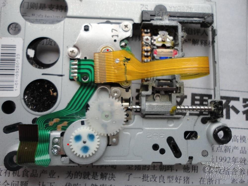 21UMD机芯反面图红点处可以看到两个电机一个是移动激光头的另一个是旋转光盘用的