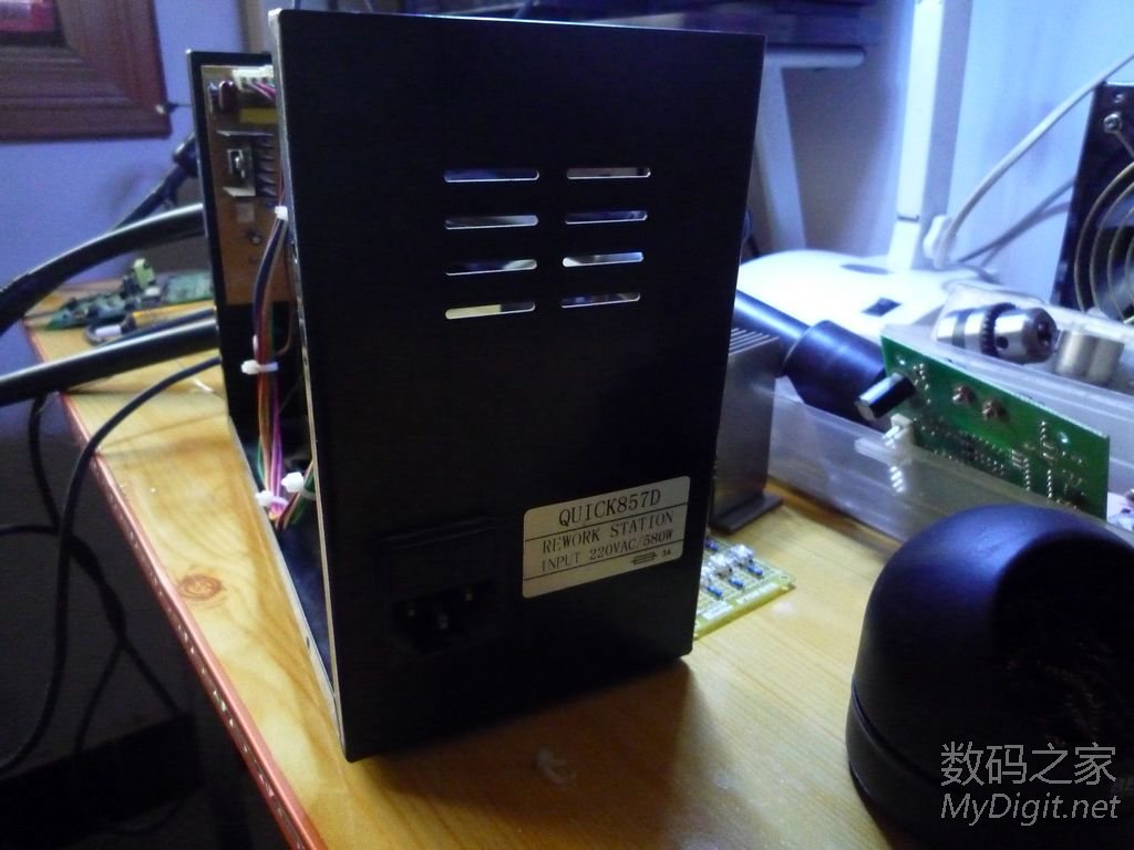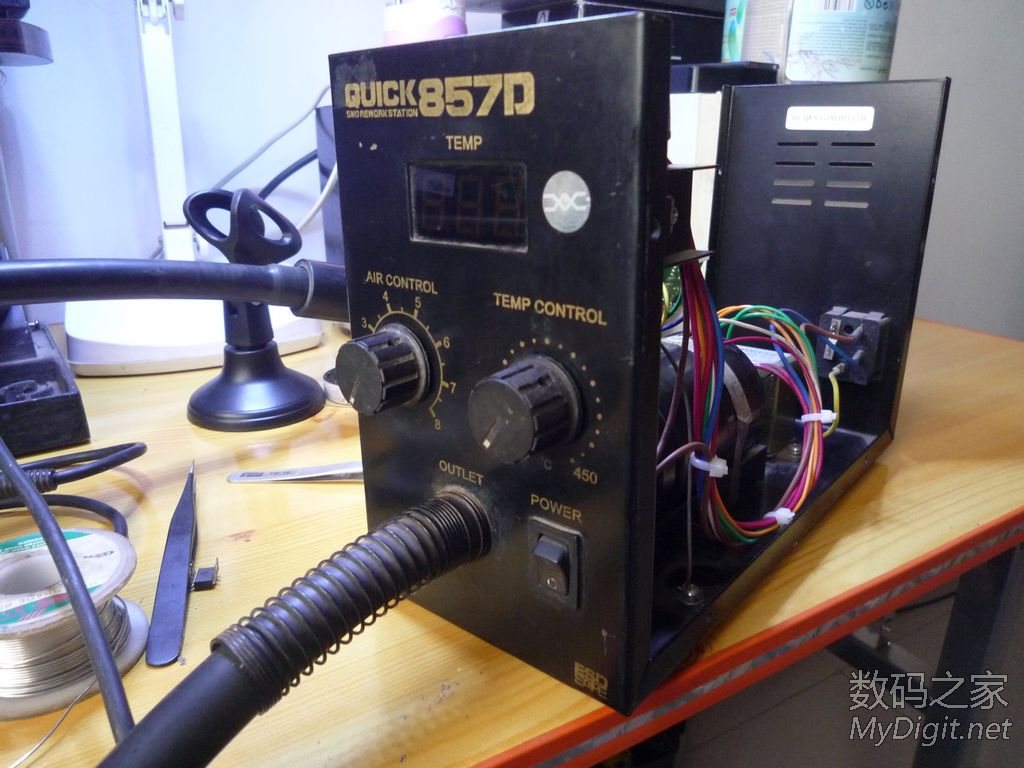 今天去电子市场转着玩 看到一台快克857D 数显的 看着不错就拿下了,回家试机觉得噪音有些大,而且没有延时关机功能是个缺陷,早期的产品有些不成熟呀。顺手拍了几张照片 传上来让大家瞧瞧。