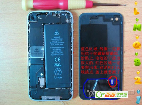 9.抗干扰磁贴屏蔽纸把线圈贴合,注意:一定要把WIFI触点(红色圈圈)给留出来,不然WIFI就悲剧了.