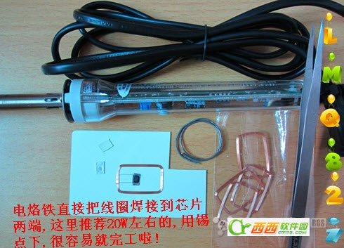 7.取出芯片后,用电烙铁小心的把线圈焊接上,电烙铁一定要把温度调的相当低(用20W以内的最好),芯片怕高温的,接近完工!