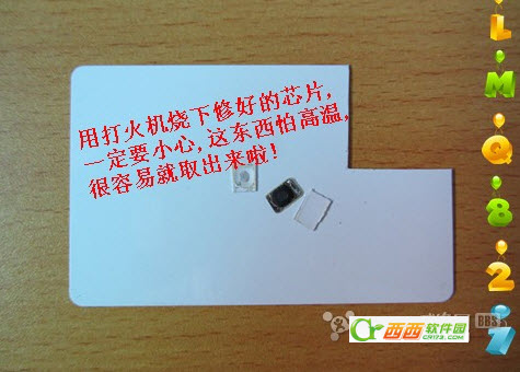 6.芯片快出来时,用打火机烧下芯片(有些质量一般的卡不用打火机烧直接用美工刀也很好取),这样外面一层薄薄的PVC就轻松脱落啦,露出我们最终想要的芯片,
