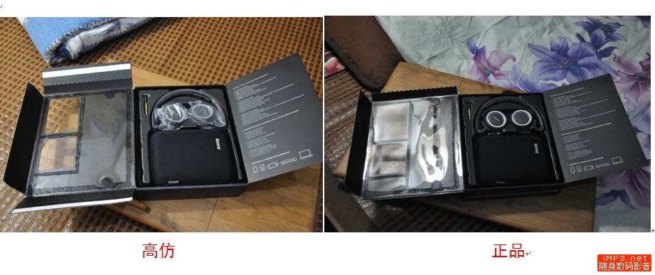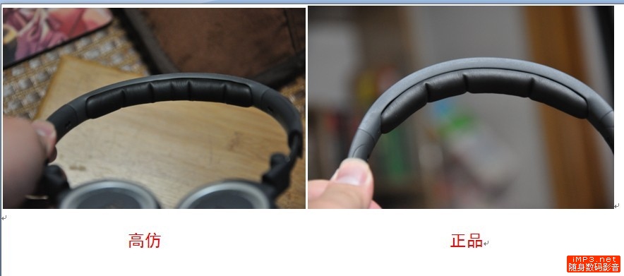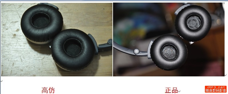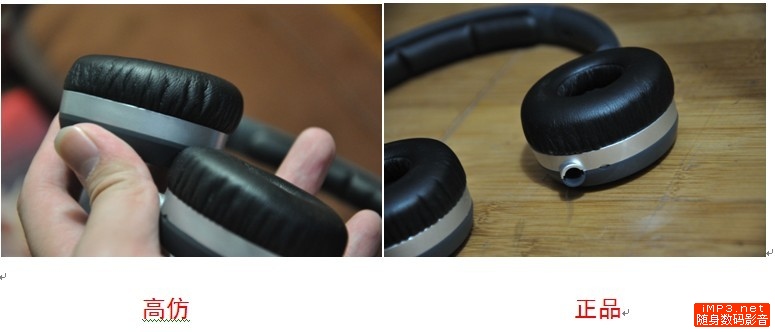 这个对比以后不难发现,假货的皮质量比较差,且褶皱比较多,给人的感觉像是要老化的皮,而正品的皮很柔软,而且褶皱少,比较平滑~~~其实假货的工艺差也反映在这里,第二张图里假货耳机的海绵都有点凸起来~~~还是一句话做工不地道,虽然已经很像真品了。