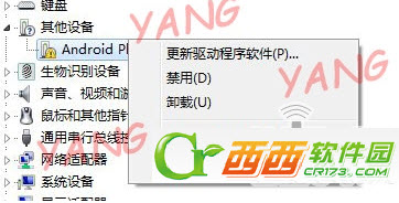 进入设备管理器,右键在未识别出来的那个Android xxx的设备上点击,选择“更新驱动程序软件”
