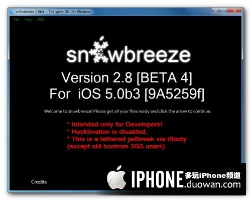 另外,iH8Sn0w也宣布,Sn0wBreeze也已经更新,可越狱iOS 5.0 beta3。在使用Sn0wBreeze越狱时,请确保itunes更新到10.5 beta 3,因此这也是一个只提供给开发者的越狱。