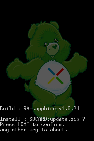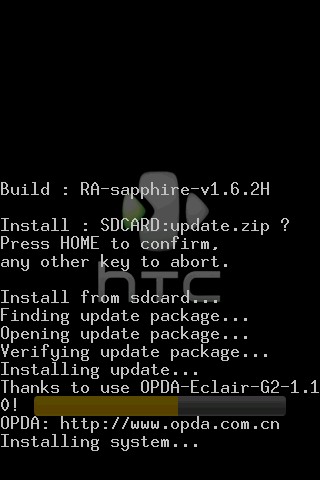 选择update.zip后,会弹出如下图提示。然后再按下Home小房子键,就开始自动安装系统刷机了。