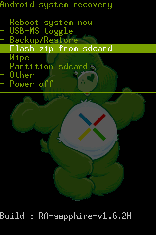 然后关机,按住Home小房子键的同时按开机键,即可进入recovery恢复模式,然后移动轨迹球到第四项,按下轨迹球选择进入“Flash zip from sdcard”
