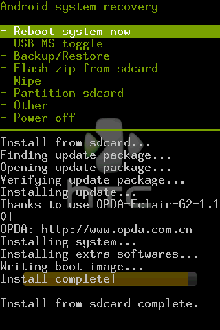 当安装完毕时,会自动进入下图这个界面,最下面那行Install from sdcard complete就说明安装成功了。现在选择第一个Reboot system now重启手机,稍等片刻即可体验全新Android系统了!(注:刷机后首次开机时间较长,请耐心等待一下)