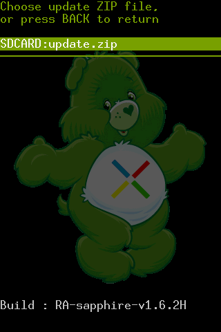 进入Flash zip from sdcard后,我们找到刚才重命名的update.zip文件,然后按下轨迹球选择它。