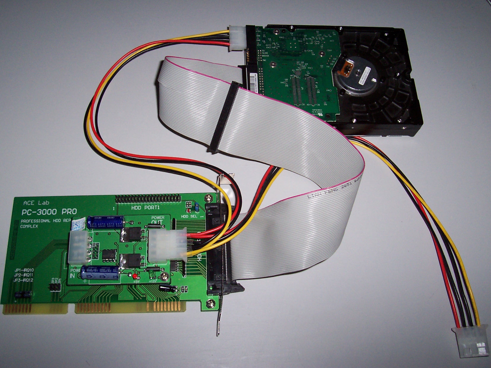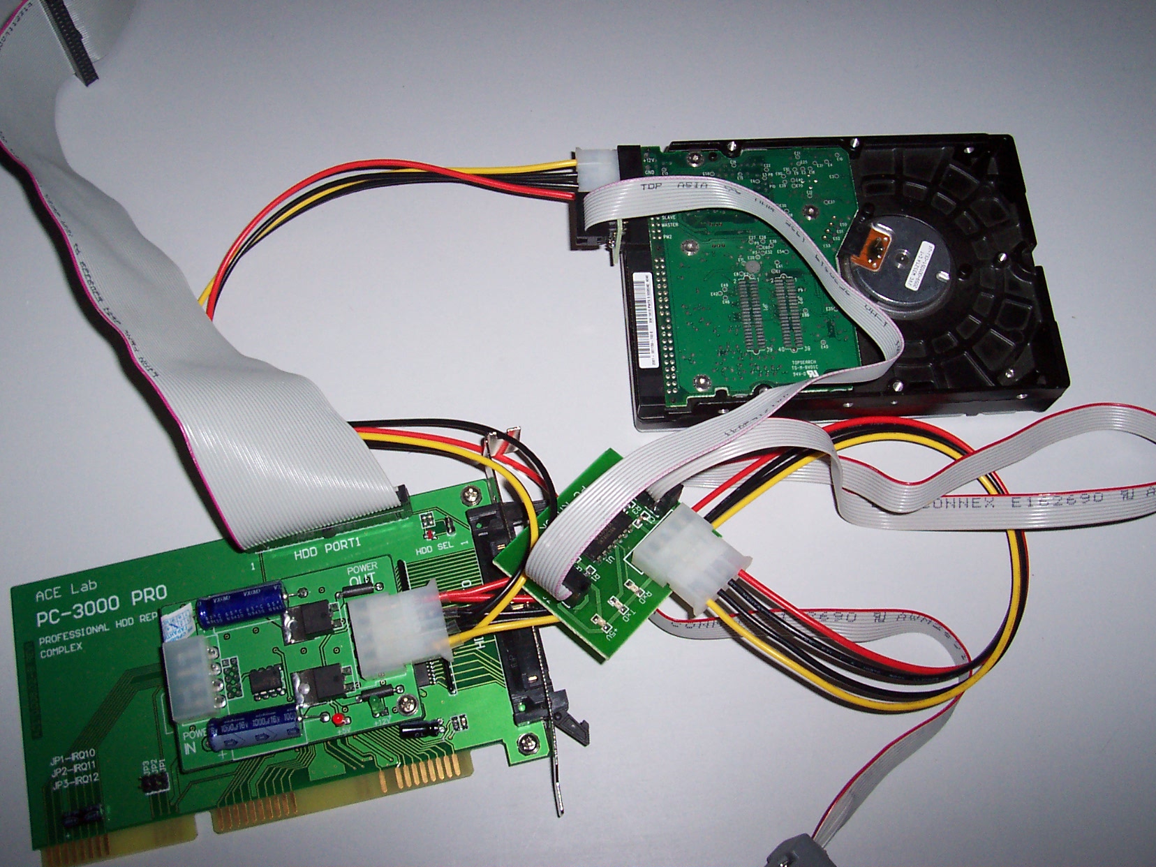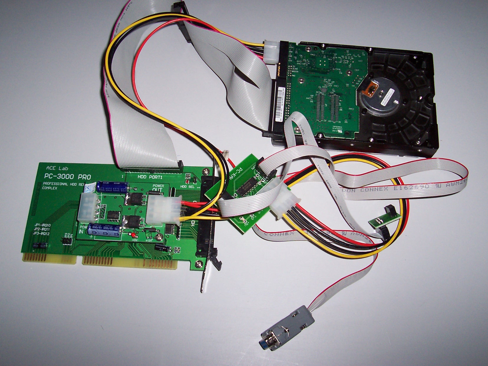 PC3000除PRO卡,加密狗外我们见到的还有一条修ST硬盘的COM线,COM线上的小板我们一般使用PC3000卡上的电源来供电,这个我们可以很容易的控制板上电源的通断.COM线一般要接入主板上的COM1或COM2接口,另一端接硬盘上的跳线针那里,一般是*近IDE接口哪边