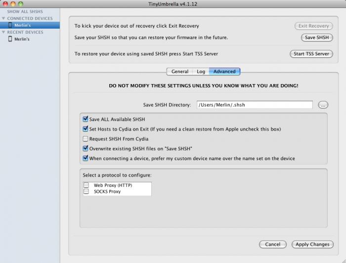 回到 Advanced 选项卡,选中 Request SHSH from Cydia,然后 Apply Changes,之后Apply Changes,再点击 Save SHSH 按钮,再备份一次,并将已备份的 SHSH 上传到 Cydia 服务器(备份两次只是为了保险,实际上上一步并非必须。)