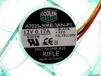 来福轴承 Rifle Bearing: 由CoolerMaster所研发的来福轴承技术采用带有反向螺旋槽及挡油槽的轴芯,在风扇运转时含油将形成反向回游,从而避免含油流失,做为含油轴承的改经型,来福轴承有效提升了轴承的使用寿命。而从成本上和含油轴承比起来也没有多大的提升,可以说是低端产品中间一个比较不错的经济型解决方式。