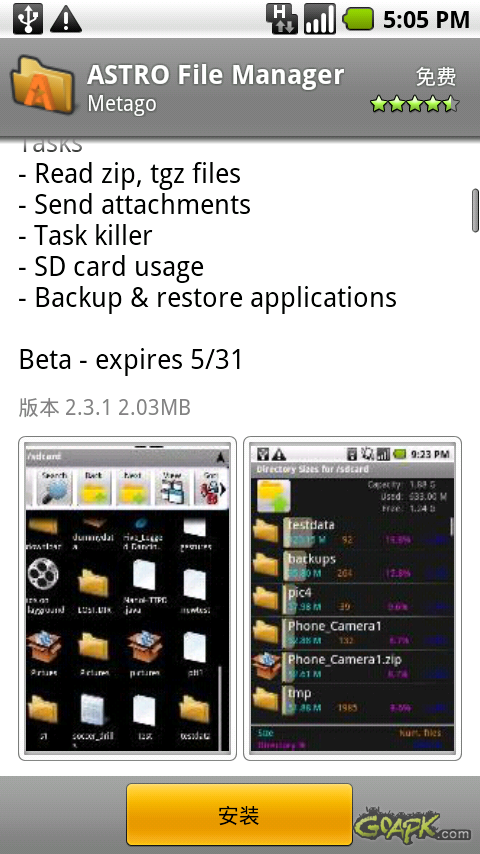 进入市场搜索ASTRO,这是一个比较好用的资源管理器软件,通过这个软件可以查看SD卡中的内容。