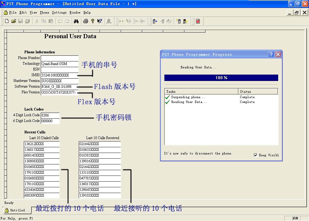五、手机的信息就可以查看了。其中IMEI是手机的串号,Software Version是手机的Flash版本号,Flex Version是手机的Flex版本号,Lock Codes就是手机锁的密码了,Last 10 Dialed Calls是你最近拨出的10个手机号码,Last 10 Calls Received是你最近接听的10个手机号码。具体如下图: