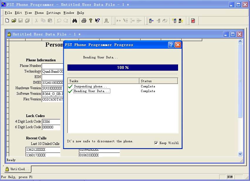 四、接着PST就开始读手机的相关信息了,到达100%就已经完成了,如下图: