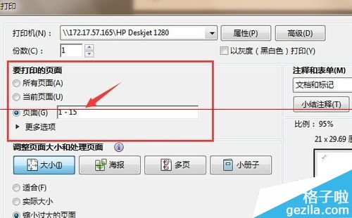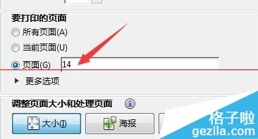 6、弹出打印对话框。找到图中所示的“要打印的页面”显示,选择第三项——页面。把默认的页数【1-15】删掉,输入我们要打印的页面【14】