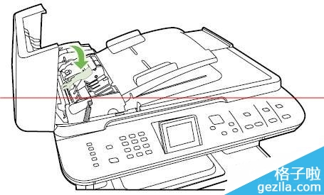 2、 提起绿色手柄,旋转拾纸机件,直至其打开。