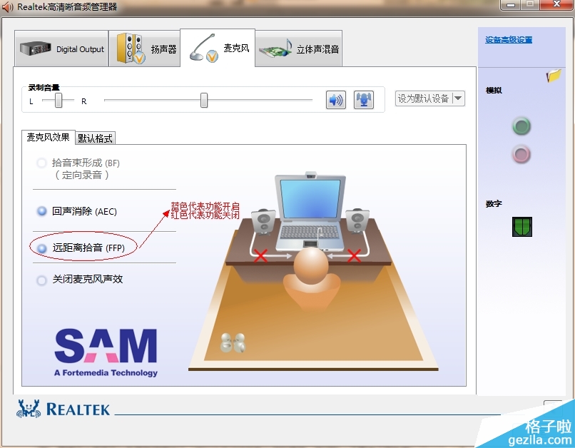 注1:"远距离拾音(FFP)"功能的作用是从距离笔记本麦克风稍远的位置收集声音,此功能开启后因使用环境的声音也会一同拾取,多数的使用环境嘈杂的声音会比较多,所以会出现所谓的“杂音”现象;此功能关闭后,因笔记本麦克风拾取声音范围减小,所以不会过多拾取外部的声音,即消除了“杂音”的影响。