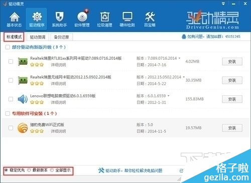 3、在“驱动程序”的界面,我们点击“标准模式”这一栏,还要在下方选择“稳定优先”,这样驱动精灵就会帮我们选择出稳定而且是最新的驱动。这时,我们点击“安装”,即可。