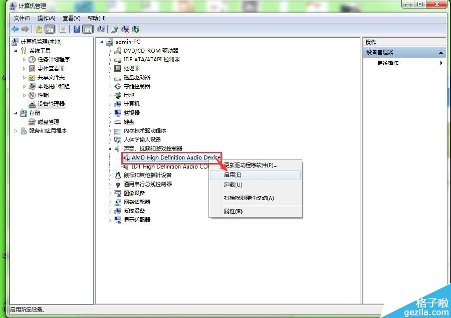 打开计算机——点击管理——点击设备管理器——查看声音、视频和游戏控制器。检查声卡在设备管理器中有没有被禁用(如图)。