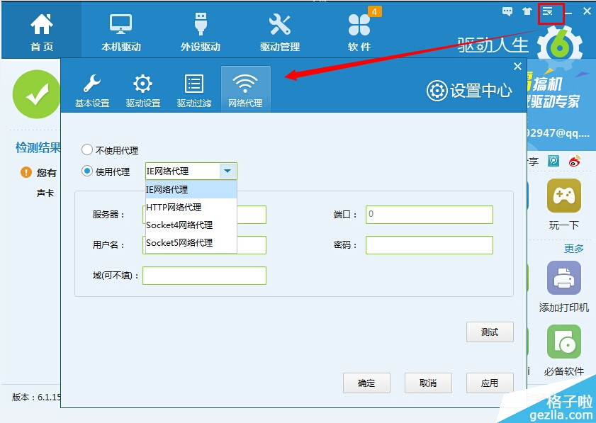 这版驱动人生还新添加了代理联网的功能,何为代理联网呢?通俗点说就是网络翻墙,由于部分网站和应用的限制,导致驱动人生无法正常使用。有这部分困扰的童鞋注意了,点击驱动人生右上角的设置,弹出有网络代理的窗口,勾选使用代理,然后填好下面的设置就可以愉快的用驱动人生更新安装驱动啦。