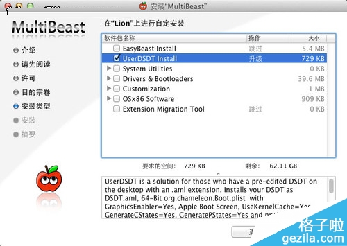 然后运行MultiBeast软件,勾选第二项“UserDSDT Install”前面的方框,就会开始更精准的安装。
