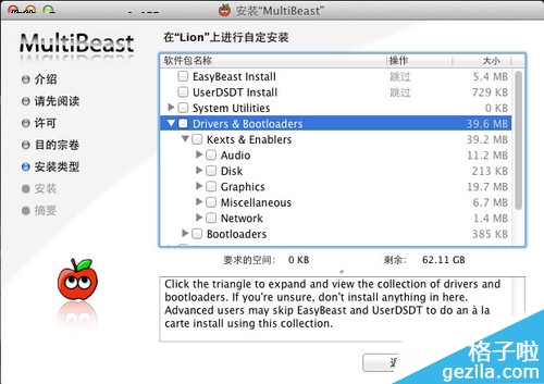 选择EasyBeast 安装,MultiBeast软件会自动安装以下文件到Mac系统的/System/Library/Extensions/目录: