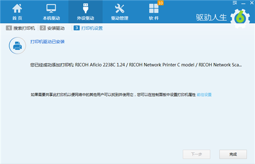 3、在打印机搜索页面只需点击搜索打印机,驱动人生6便自行搜索检测局域网内的打印机型号,并显示在主界面,如公司有几台打印机的,在此便可以自行选择所需的打印机驱动点击下一步进行安装即可;