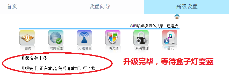 5. 需升级文件2的用户,请按升级文件1的步骤再进行一次完整的升级流程。文件2升级完成后,盒子的名称及密码会恢复到出厂设置。