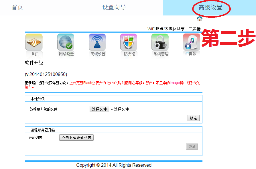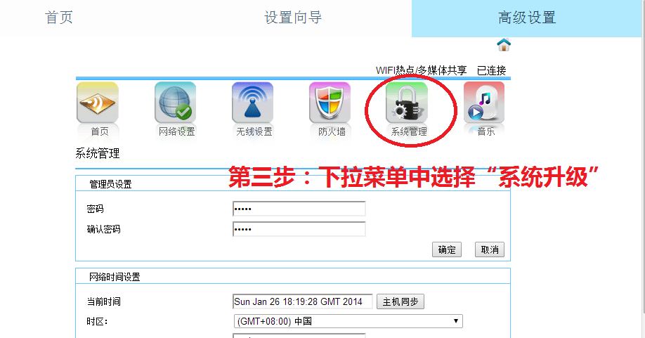 3. 打开Web界面,点击“高级设置”点击“系统管理”选择“系统升级”。