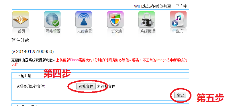 4. 在软件升级界面,点击“选择文件“,选择下载到本地的文件1 Baidu_2.4.105.232_20140125100950.bin,点击”确定“方可进行升级。注:设备升级过程中请勿断电,升级成功设备会自动重启,音乐盒红灯时请勿断电!