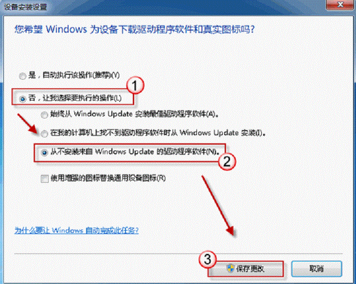 3. 弹出的新窗口会问您是否希望 Windows 为设备下载驱动程序。我们选择第二个“否,让我选择要执行的操作”。这之后,会弹出更多的几个选择项。我们选择第三项,阻止驱动程序的自动安装。