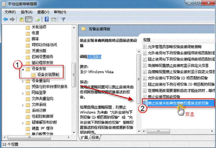 2. 依次定位到“计算机配置->管理面板->系统->设备安装->设备安装限制”,在右侧细节窗口中,双击打开“禁止安装未由其他策略设置描述的设备”。